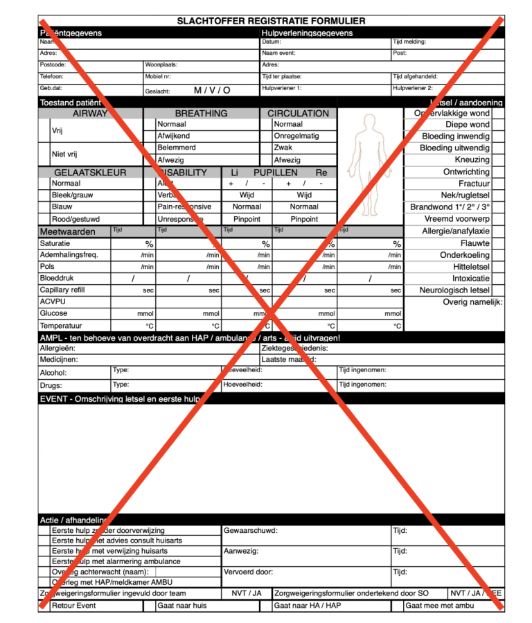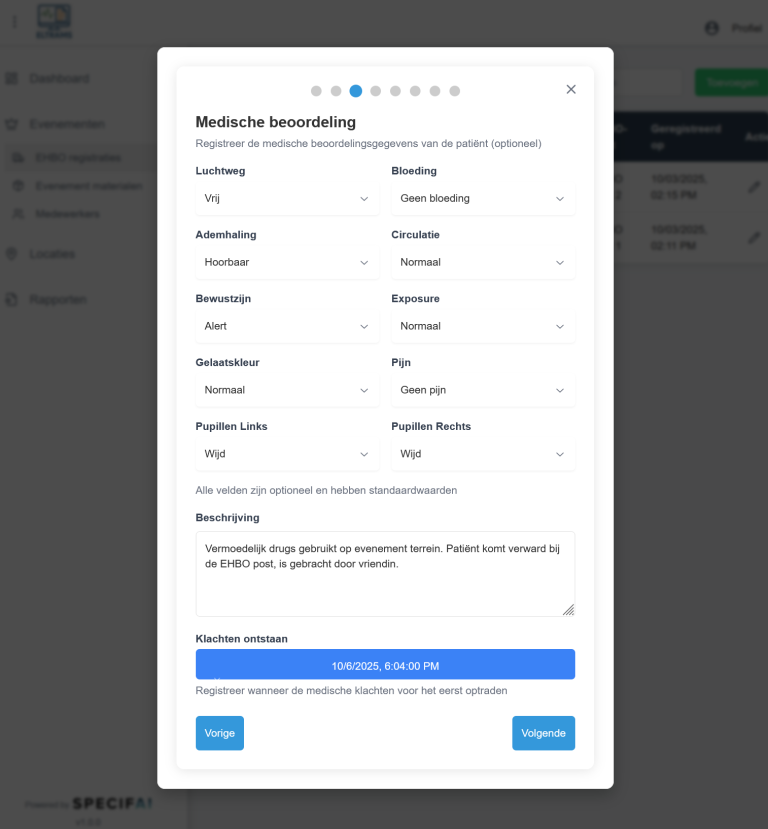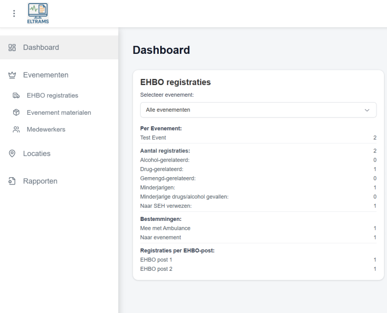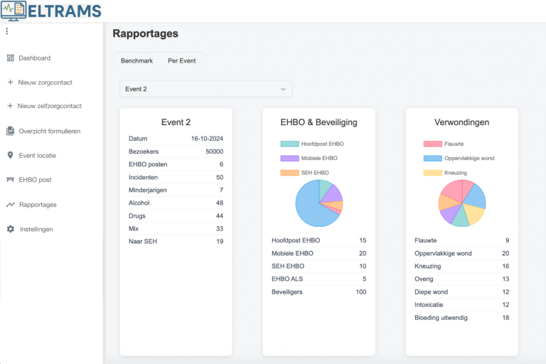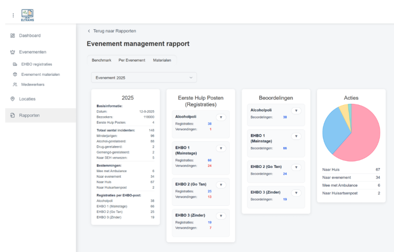 - Bestemming na beoordeling: direct overzicht wie naar SEH (Spoedeisende Hulp) is verwezen, wie naar de HAP (Huisartsenpost), wie gezien is door de ambulance en wie terug naar het evenement is gegaan.