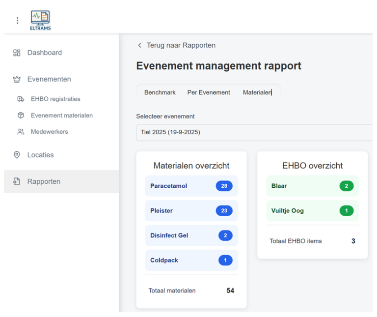 In ELTRAMS registreert iedere medewerker met één klik welke medische materialen zijn gebruikt. Zo bouw je automatisch een compleet beeld op van verbruik per post, event, team en periode. Het resultaat: gerichter inkopen, minder verspilling en altijd de juiste voorraad op de juiste plek.